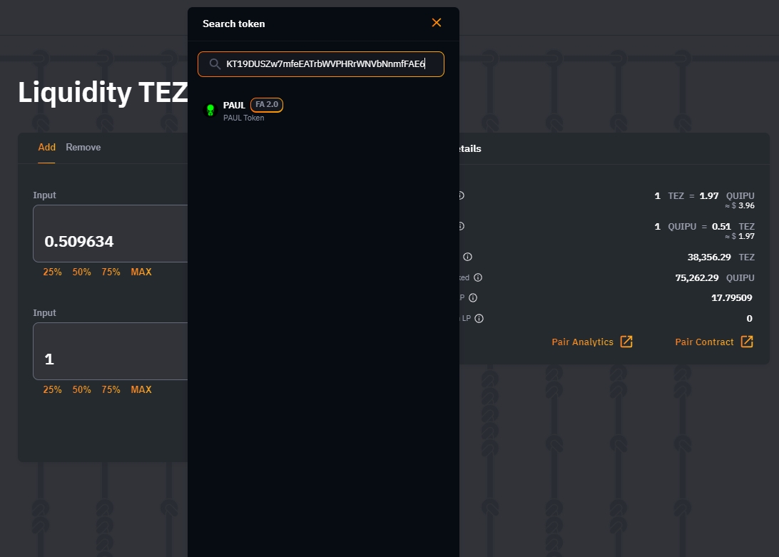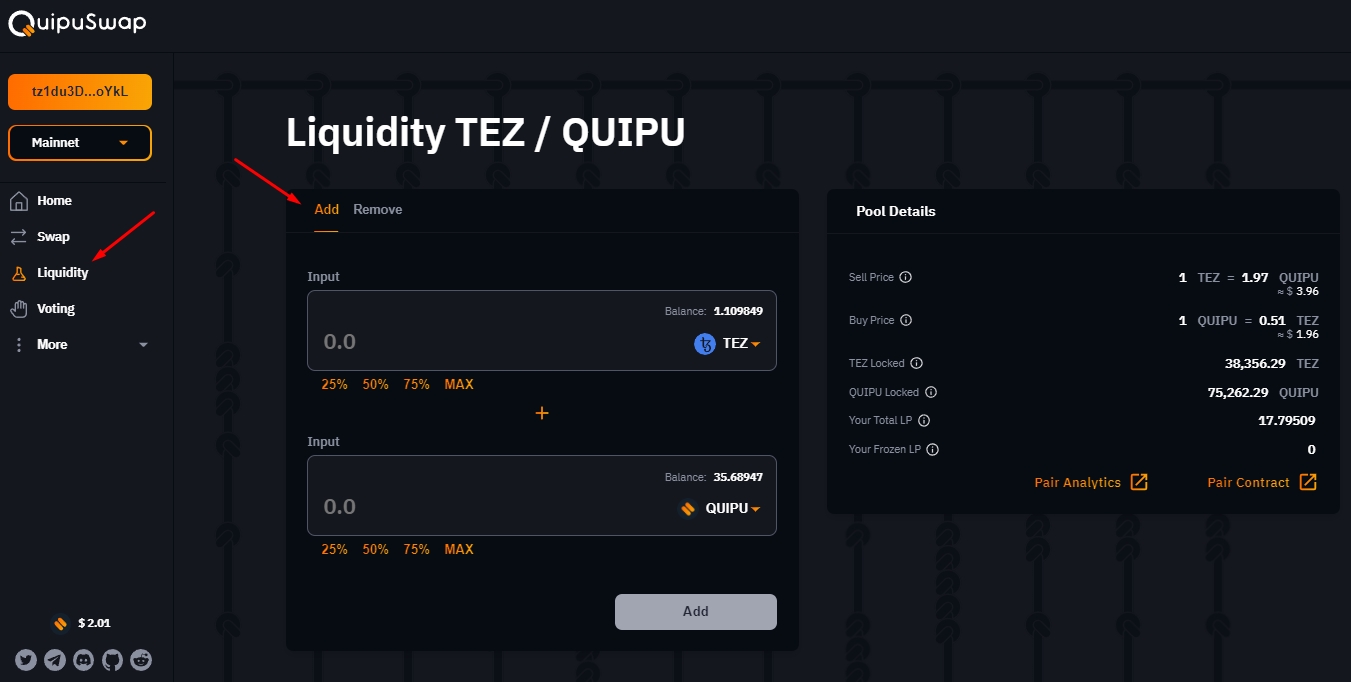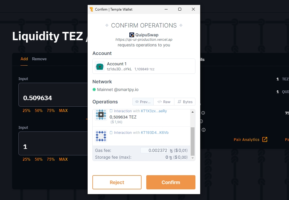 1. Log into QuipuSwap via Tezos dApp wallet. We recommend using the Temple wallet.